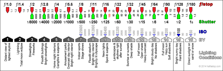 When the ISO is aligned with the given Lighting Conditions/EV, the shutter speed and ƒ/stop combinations are equivalents and will produce the same exposure with different results.