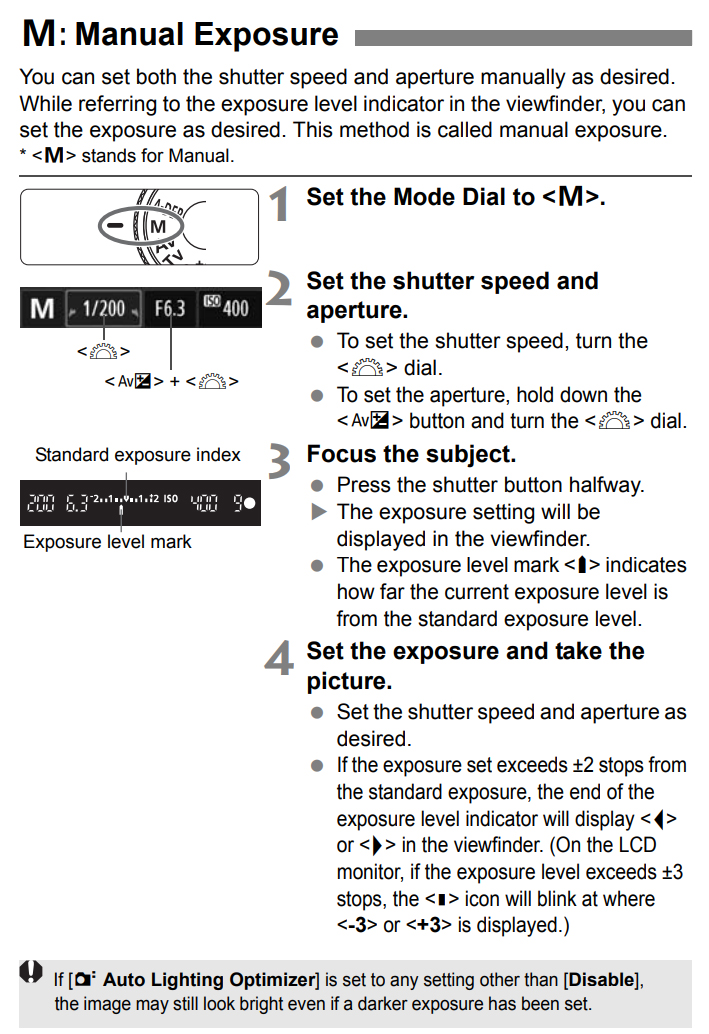 The Shutter Speed, Aperture and ISO represent the Exposure Triangle and when the Exposure Indicator is set to zero these three items are in balance creating the proper exposure. Changing the value of one requires adjustment of the other two settings, otherwise, the exposure will be overexposed (too light) or underexposed (too dark).